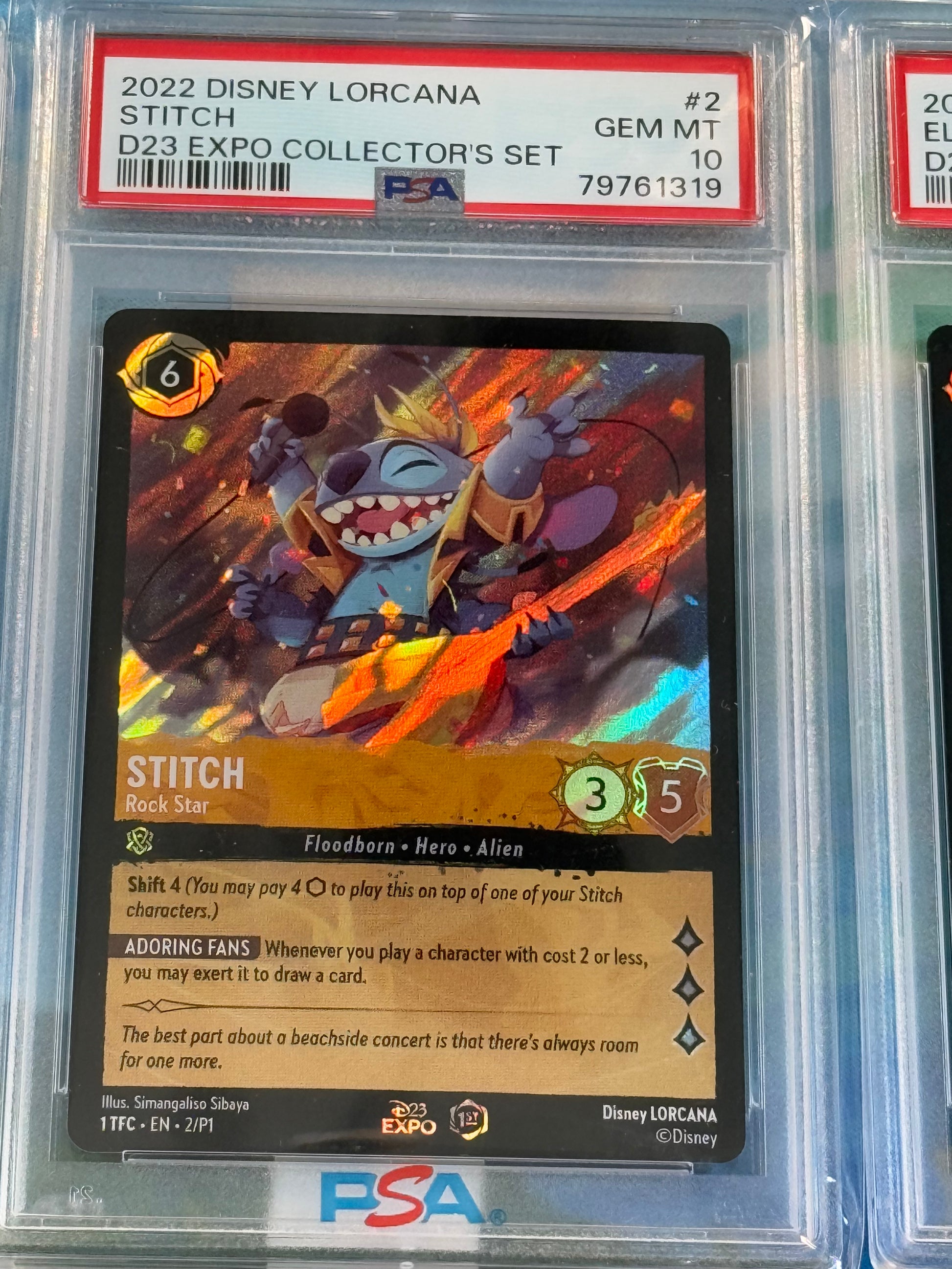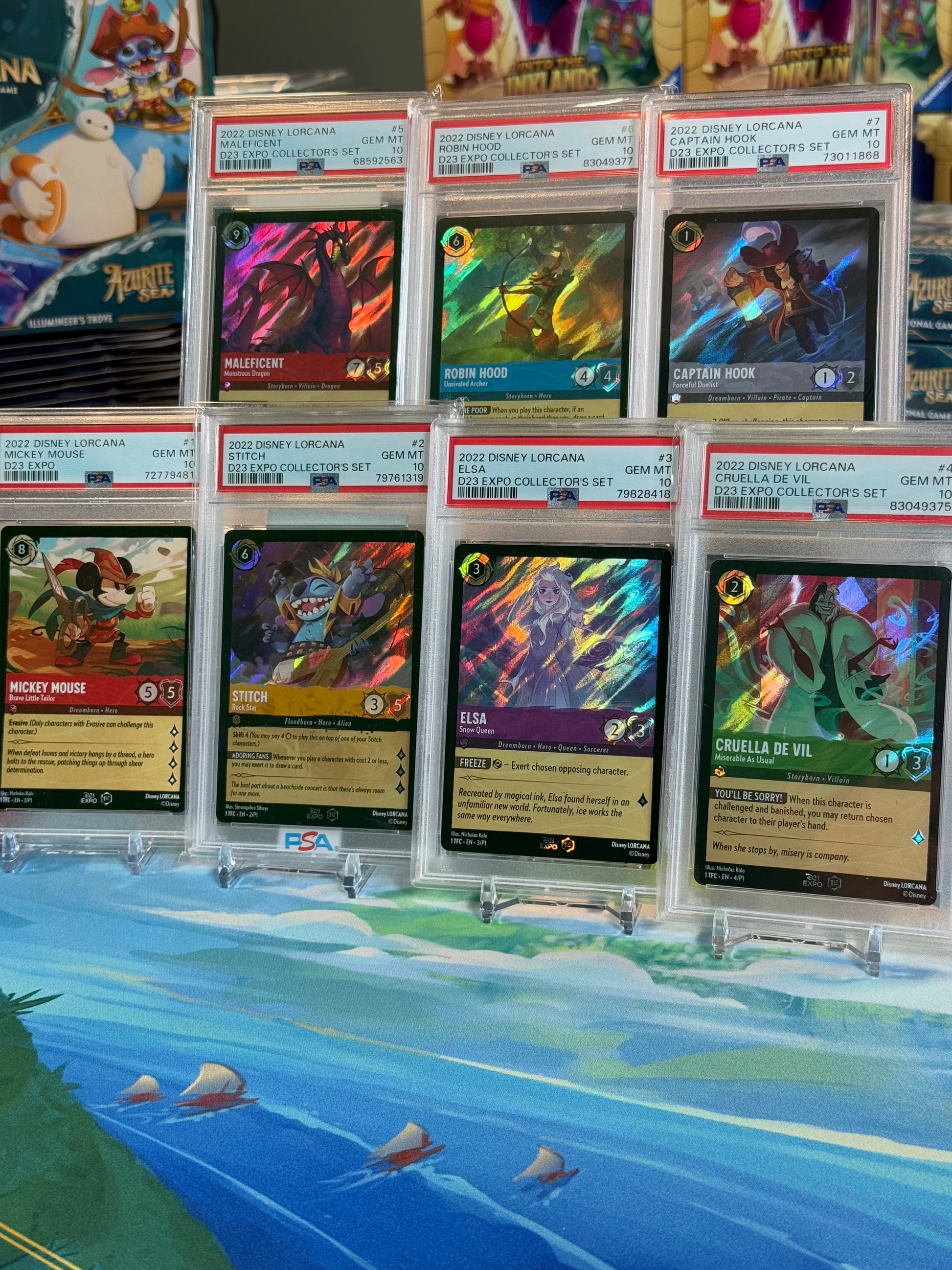 Authentic Disney Lorcana Promo Card Set 1st Edition 2022 Lorcana Set of 7 card number 1-7/P1. All graded PSA 10. These include Mickey Brave Little Tailor and the 6 Disney D23 Expo 2022 Lorcana Collector’s Set of 6 Cards. All 1TFC cards make up the Exclusive 1st Edition set: