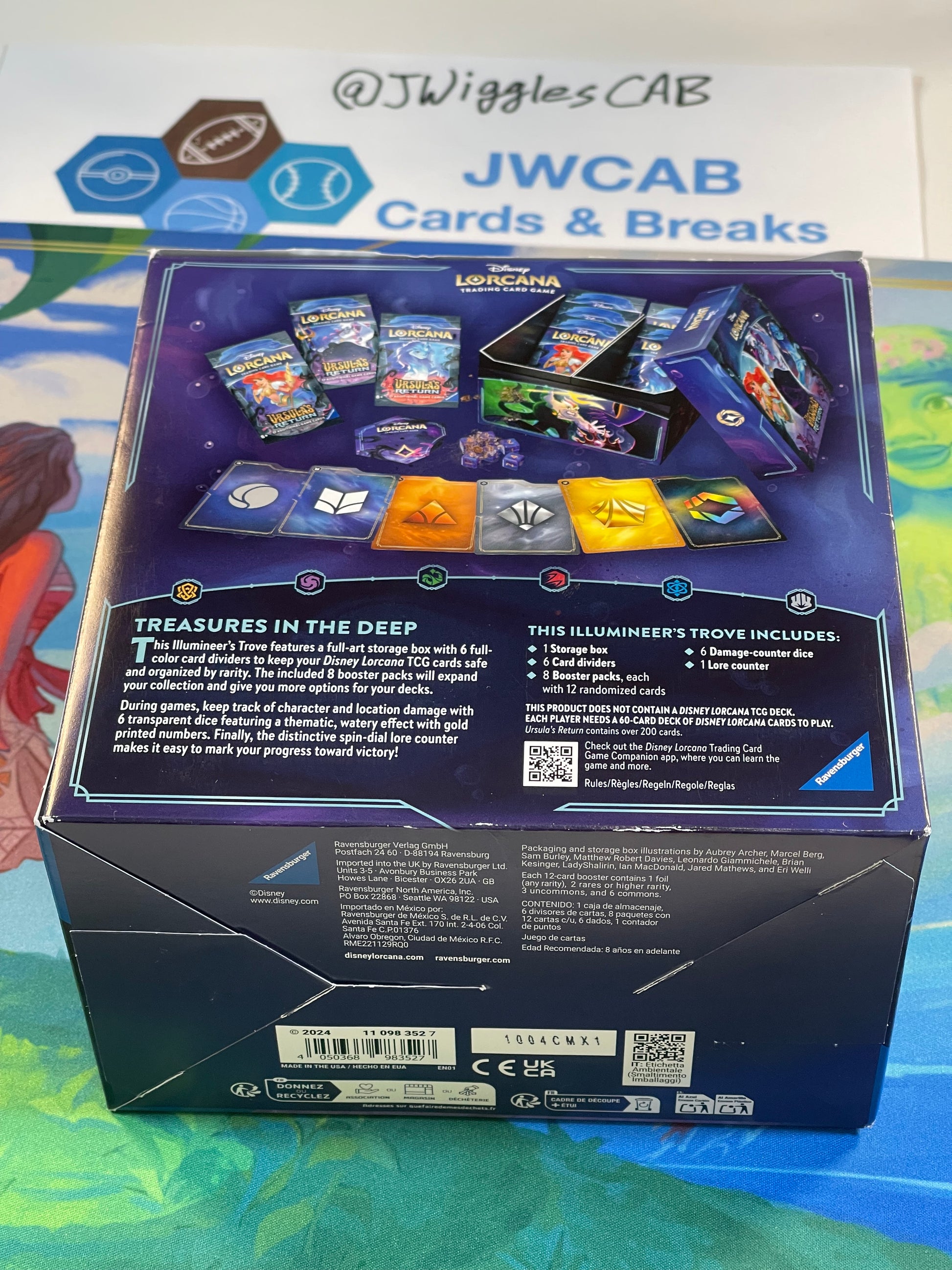 Brand new factory sealed and directly sourced. These Disney Lorcana TCG: Ursula’s Return Illumineer’s Trove Boxes are in near mint or better condition. They contain: